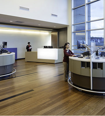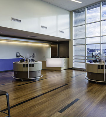 The ceilings in the main lobby were a sloped design and used a large 4 ft. by 4 ft. tile and aluminum coves at the glass storefronts. This design enhanced the look of the height and size of the lobby space.